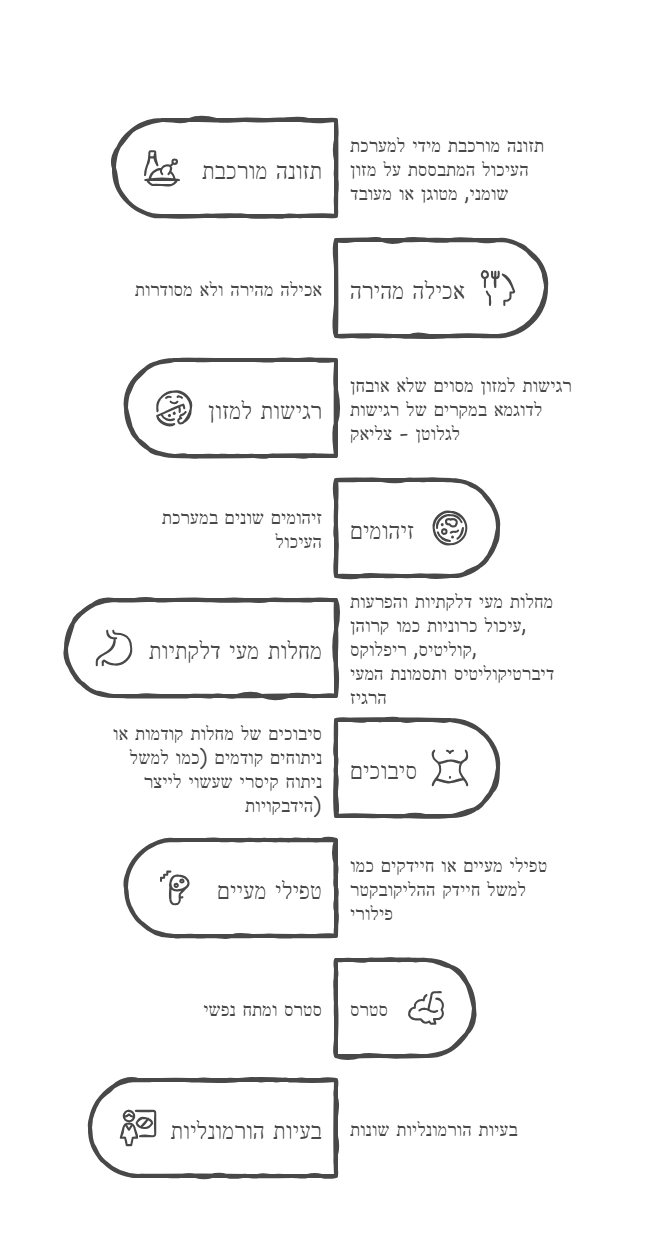 מערכת העיכול שלנו מושפעת מגורמים שונים כמו מצב רגשי, טיב השינה שלנו, אורח החיים אותו אנחנו מנהלים ועוד. כאשר ישנם גורמים המקשים על פעילות מערכת העיכול היא מגיבה באמצעות אותם תסמינים, לכן חשוב לאתר את המקור בכדי לפתור את הבעיה ולצמצם את הסימפטומים.