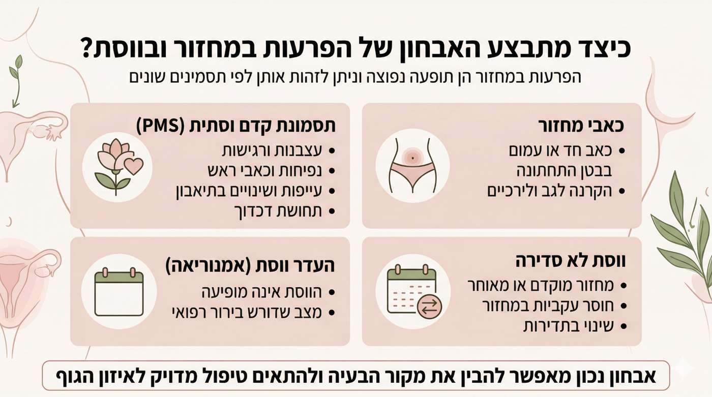 כחלק מתהליך האבחון אני בוחנת את סדירות המחזור, צבע הדם, גיל קבלת הווסת הראשונה וכל התסמינים והכאבים הנלווים סביב הדימום. ווסת שמופיעה באופן סדיר ותימשך סביב חמישה ימים תעיד על זרימת דם תקינה בגוף המטופלת. ווסת לא סדירה, בתדירות נמוכה, תעיד על חולשה בתהליך הייצור של הדם, על חוסר איזון כללי ועל קצב לא קבוע של הסייקל בגוף. מחזור קצר יעיד על עודף חום בדם לעיתים, שמוביל לתנועה מהירה של הווסת. צבע דם חיוור יעיד על חולשת דם, צבע דם כהה יעיד על עודף חום וסטגנציה של הדם. ועוד.